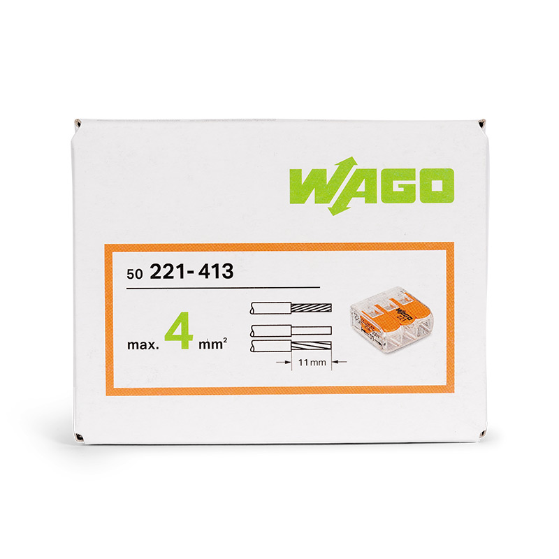 De Wago 221-413 lasklem is een isolerend kunststof omhulsel met insteekopeningen. Je kunt hiermee twee of meer installatiedraden met elkaar verbinden. De WAGO serie 221 lasklemmen zijn wel 40% compacter dan de voorgaande varianten. Ideaal dus voor kleine en moeilijk toegankelijke ruimtes.